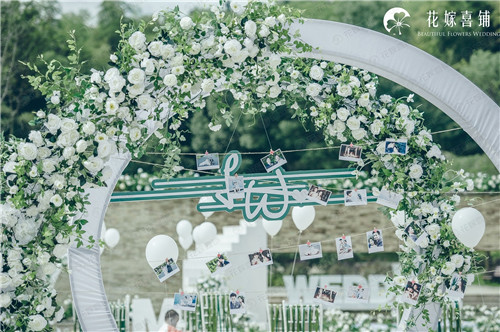 欧式露天草地婚礼很浪漫优雅,翠绿的草地上布置,很好的利用了空间,生机与活力也在这里弥漫开来。新鲜的花卉盘绕的圆弧形拱门,再加上两侧花朵摆放,营造了浪漫优雅的氛围。小座椅在两侧环绕,很整齐利落。新娘和新郎的婚纱照在入口处摆放,起到了很醒目的效果。