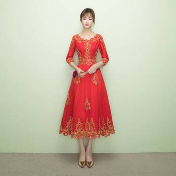 假如是矮个子的姑娘,那么敬酒服应当挑选短款的,可是也不算是很短款,这款敬酒服是长袖的版型,立体印花的装点旗袍领的装点气质展现,下摆就比较的简约。