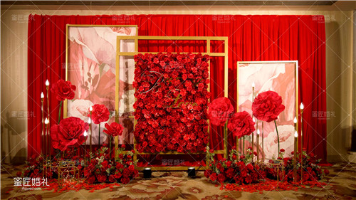 婚礼现场的布置十分的喜庆,选用了大红色,婚礼现场热情浓郁,精致典雅,有点复古的风格。婚礼现场使用红色丝绒布梭打底,高贵优雅,然后用了仿真花艺的花墙,一点也不假,花墙礼盒也是十分精致,神秘优雅。仪式通道两旁怎么少得了金属镂空花艺,绽放精致之美。但是整个婚礼现场一点也不单调,因为在红色的背景下面还搭配了复古的油画,让婚礼现场立马高档起来,和花墙十分的搭配,复古油画尽展轻奢复古之美。