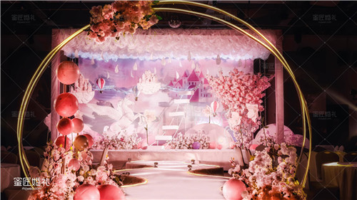 是一场十分浪漫的婚礼主题,婚礼现场布置的格外浪漫大气,婚礼现场用了粉色的仿真樱花树,很浪漫,而且在仪式通道上面有高低错落,颜色五彩斑斓的粉色泡雕棒棒糖,充满了少女心,绸带的铁艺拱门旁边有着樱花树深情依借,粉嫩的糖果世界妙不可言。在婚礼迎宾区还有粉色的热气球装饰,十分的可爱,梦幻甜美。