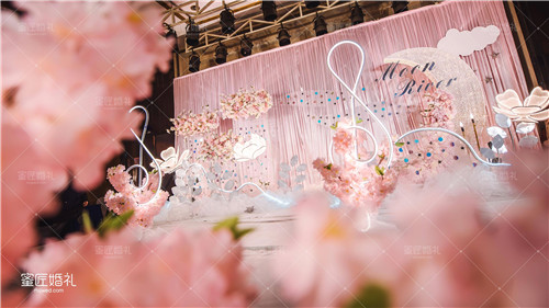 月半小夜曲也是一款浪漫高端的婚礼主题,婚礼主舞台实用浅色的冰丝布幔打底,飘带造型,梦幻唯美,然后搭配了粉色的瀑布花艺,耐看又精致,发光的蕾丝花在婚礼现场格外的出众,马上就增强了婚礼现场的气质。在粉色的布幔下面有浪漫樱花雨点缀下方,每一处都体现了幸福浪漫的感觉,让婚礼现场更加的饱满,有发光的音符铁艺搭配,灵动浪漫。