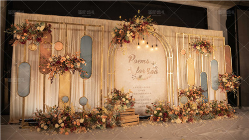 给你的诗整个婚礼现场的用色就是十分的复古典雅,十分的文艺。婚礼现场也有许多漂亮的色块,在婚礼现场也是十分的突出,还有悠然盛开的花朵,仪式通道上门洒落的花瓣,灵动自然,悠然芬芳的花朵让婚礼现场有了一丝浪漫。高低错落的色块和花朵完美搭配,一路相伴。