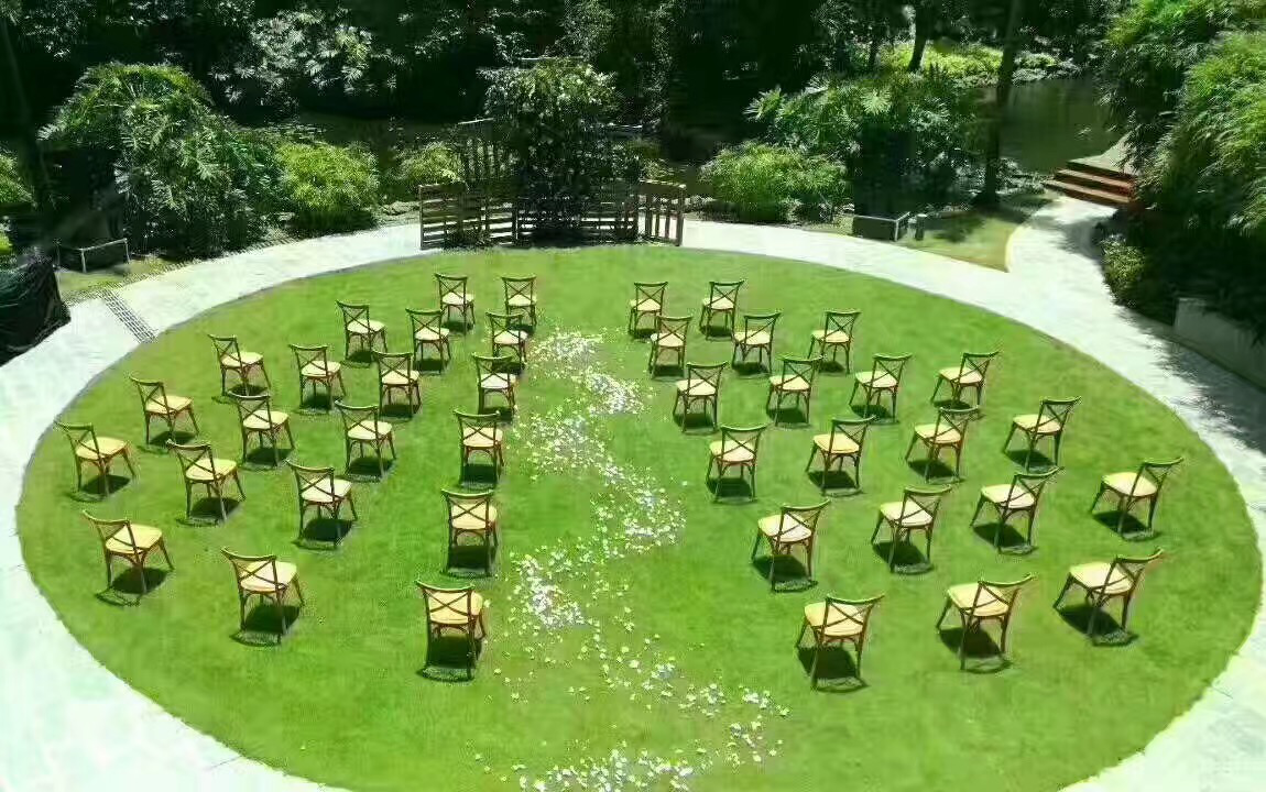 草坪婚礼的场地不像教堂婚礼,场地局限性很小,椅子可以随意摆放。一般来说,草坪婚礼上的椅子可以摆放成规矩的四方形、弧形和螺旋形。四方形适合比较正式的婚礼风格,而弧形会给人一种亲切之感。螺旋形是一种相对更富有新意的摆放方式,但也会有给新人和嘉宾造成一些不便,比如新人要经过长长的螺旋形过道才能到达场地中心的宣誓台,拖地婚纱就会造成新娘的行动不便,从而影响整场婚礼的质量。