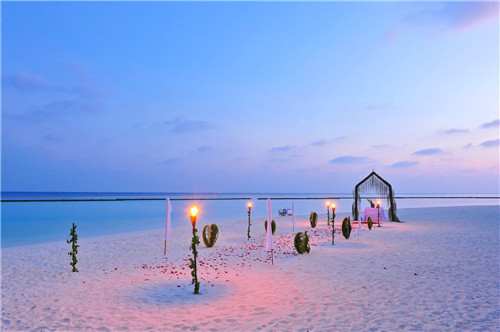 一般来讲,沙滩婚礼的主色调以清新自然为主,因此大多的婚礼主色调以蓝白相间或是绿色为主,凸显自然之气和沙滩海景的美丽。大家在布置沙滩婚礼时,较好将所有的物件颜色,包括婚礼主舞台的背景、桌椅等颜色协调一致,只要能和身后蔚蓝的海景颜色融为一体,这样的主色调都是可以的。