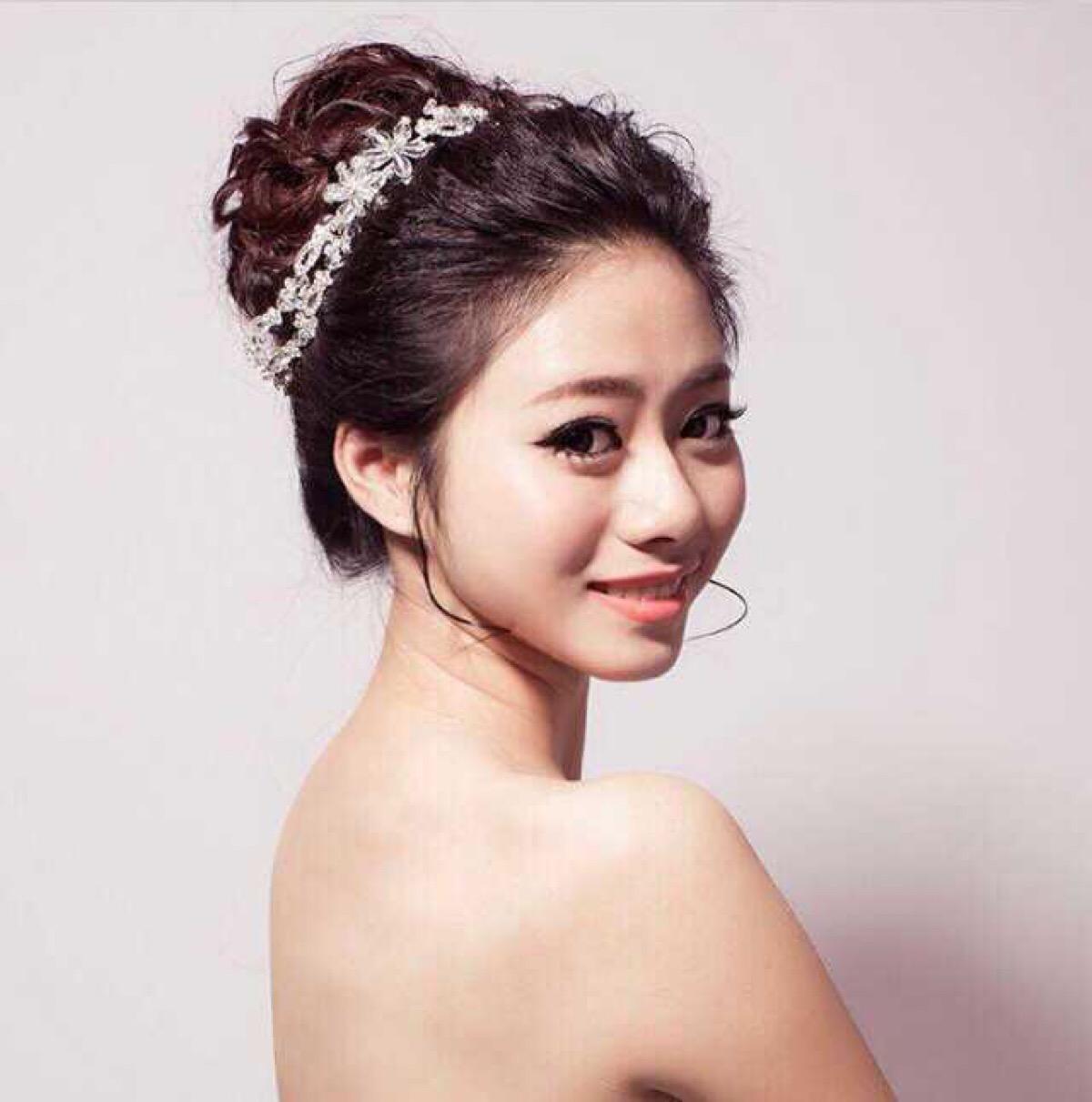 将头发都盘在脑后,搭配华美的发饰,如皇冠、珍珠等,就会使得新娘看起来非常高贵。