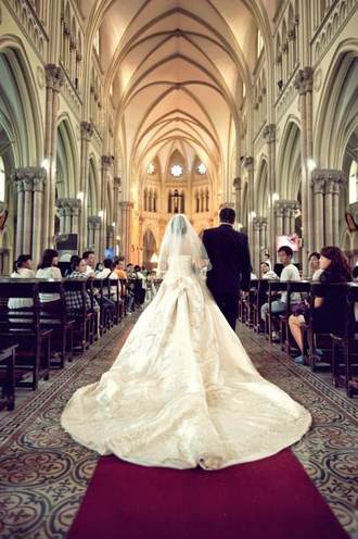 1、新娘的正确穿着:无论基督教堂还是天主教堂举办婚礼,新娘都必须穿着白色的婚纱礼服;教堂婚礼对婚纱的款式也有一定的要求,端庄大气的拖尾婚纱是较适合教堂婚礼的婚纱。