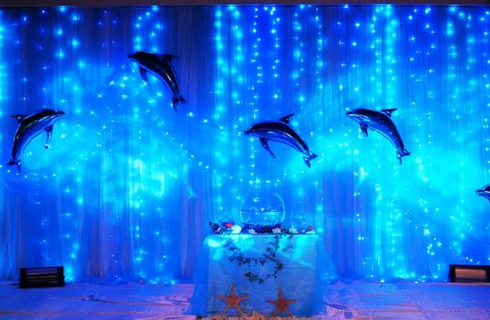 舞台布置可以算是较新颖的地方了,而布置方式有两种,较好种是以传统的舞台背景布及一些舞台装饰来进行现场布置,这种布置可以与沙滩婚礼风格相类似,比如说舞台背景布上可以印制一些小动物,而背景布的颜色主要为蓝色,其中再包含少许白色,利用渐变色方式让蓝色与白色相交融,就更有了一番大海的感觉。然后在舞台上可以放置一些贝壳、小海星、椰子壳之类的小摆件,就更显示出了我们的蓝色海洋主题。第二种就是租用比较大的透明水缸,里面可以布置一些水草与海鱼,还有海里的礁石与沙砾,这样来布置的婚礼现场背景是不是很有感觉呢?