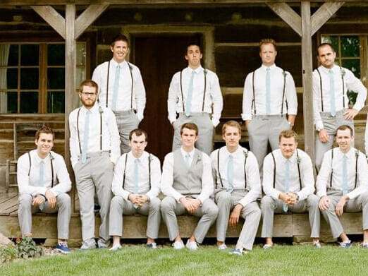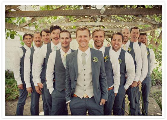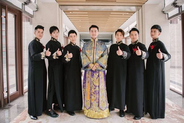 3、给伴郎团选择一款时尚的统一灰色西装,新郎的话只需要面料下点功夫就可以了,富有光泽感以及纹理高贵面料设计的都是上选。