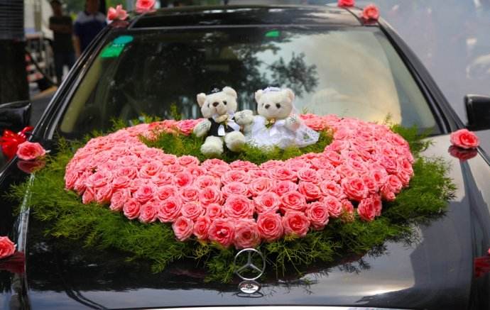 3、车头。虽然现在婚车装饰方案众多,五花八门的造型让人眼前一亮,但是简单的装饰比较耐看。如用玫瑰装饰成心形、v形,加入新人布偶、毛茸茸玩具熊点缀等。显得既简介大方又不俗气。