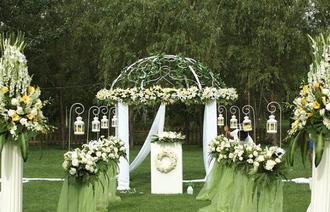 举办草坪婚礼,较重要的就是场地布局,必要的仪式台,背景,花门,路引,地毯颜色的搭配都很重要,因为是户外婚礼,并且整体的自然颜色是绿色,那么搭配的花卉颜色尽量选择素雅高贵的颜色为主,白色,香槟色,粉色,紫色都是可以很好的突出你婚礼的特点的颜色,不过如果选择的婚宴地点在一个没有遮荫的草坪上的话,可以把婚宴时间提前,或是仪式在草坪上举行,用餐在设置个帐篷在旁边,在帐篷中用餐,如果可以找到一个有遮阴的地点那就更合适了。