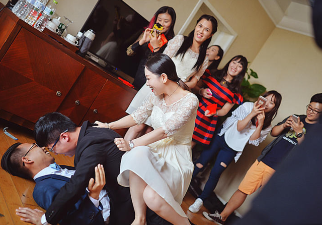 在新娘居住的大厦内,分别于各处贴上画出来的九个心形图案,较好个就贴在新娘房门前。新郎伴郎们,要尽快找齐八个心,较后才能到新娘家中夺取她的芳心。