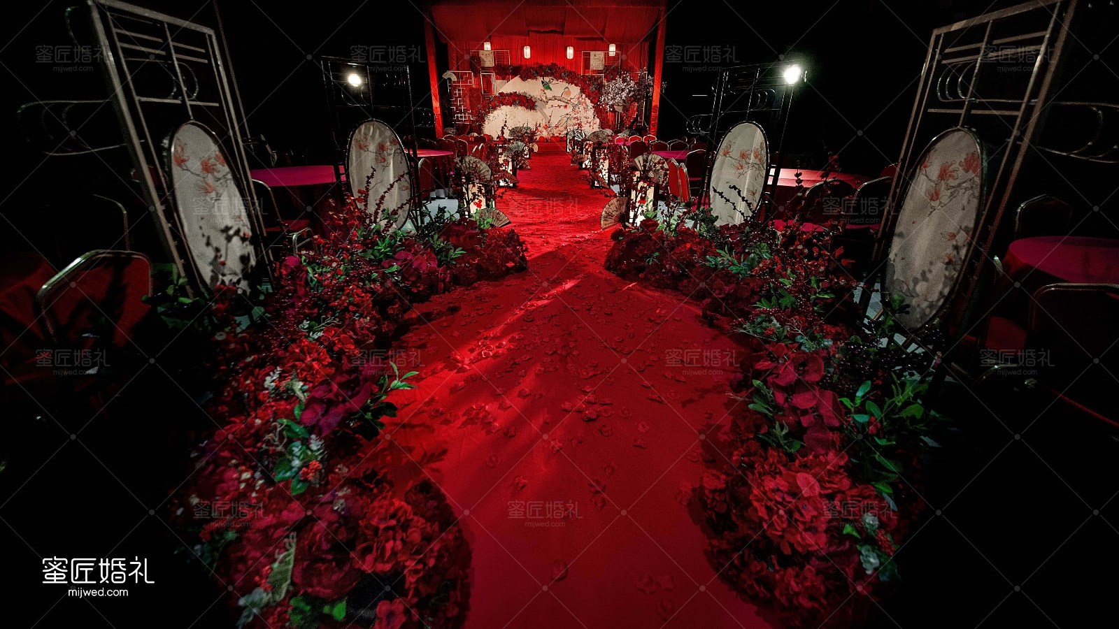 舞台背景可选择红黑色系,也可用金色整体搭配,具体的操作要根据新人的喜好也进行选择。