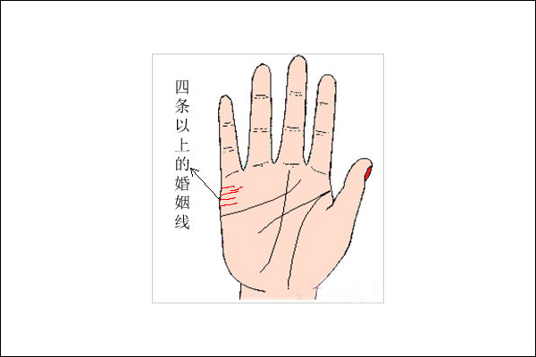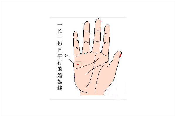两条婚姻线平行,长短相等,表示配偶性格相合,婚姻美满。两条婚姻线等长平行,距离近,爱情要有一段波折方可幸福。有三条或三条以上的婚姻线的人,爱情多不顺,容易发生自己变心了或者是对方变心了,即爱情易变,不稳定,适合晚婚。晚婚婚姻美满。