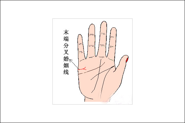 婚姻线末端分叉、或者婚姻线上分叉。都是很不吉利的预兆。意味着婚变。一生总是在迷茫中渡过,肠胃不好、如果是女士婚后多妇科炎症男士中年就有高血压糖尿病。事业上到55岁以后将有起色。之前多遇到小人,福运总被小人打压。这类手相的人,能够遇到好的另一半,但是由于其不珍惜,不懂得家的意义,喜欢玩乐,所以较后也留不住对方。