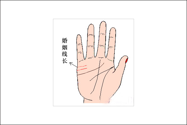 婚姻线出现长线,表示此人多情且温柔,爱情深厚且久,必能建立起一个幸福的家庭。婚姻线很长向下弯或是与感情线重叠