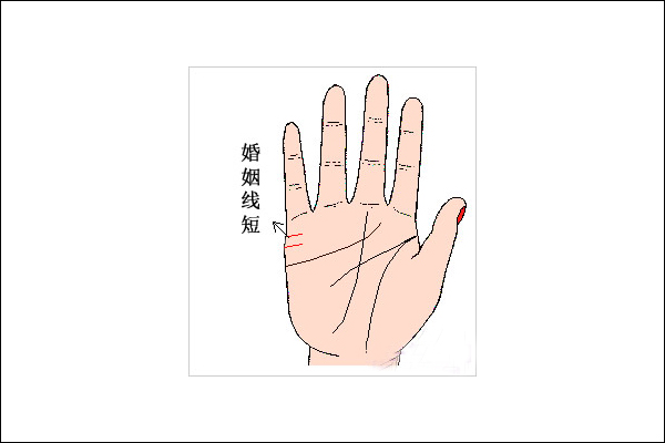 婚姻线出现短线。表示此人感情不顺利,容易争吵,脾气特别倔强。容易生病,特别是女性婚后容易得妇科炎症如盆腔炎、附件炎、输卵管疾病。男士婚后容易的前列腺炎。女性克子、男性克妻。工作容易遇到小人,多不顺利。少不得志,中年很难出人头地,到晚年才可以有所成就。