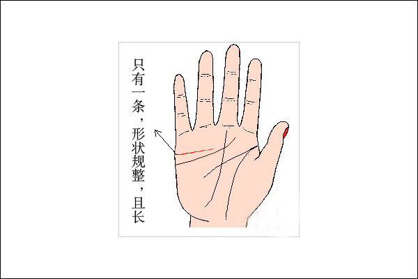 一般来讲,婚姻线只有一条,而且形状规整,深浅适度,末端略向上弯曲的,表示感情专一,婚姻比较顺利、稳定而且幸福。但这种一条规范婚姻线的人,往往很少见,大多都有两条以上的婚姻线。像这种婚姻线,虽然上弯,但末端就嫌过长,而且若没有上面那条短线更好。