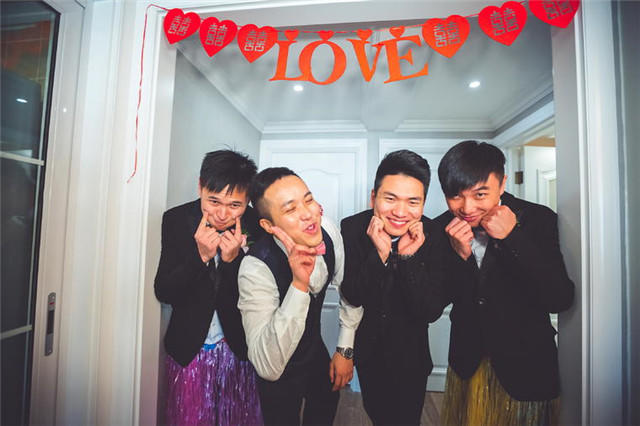 虽然看似基情四射,其实它就是一个很有爱的游戏~新郎伴郎按顺序一字排开,传递道具。道具可以是筷子、香蕉、海苔等,一定要在规定时间内完成传递,否则接受惩罚;掉落就要重头开始。