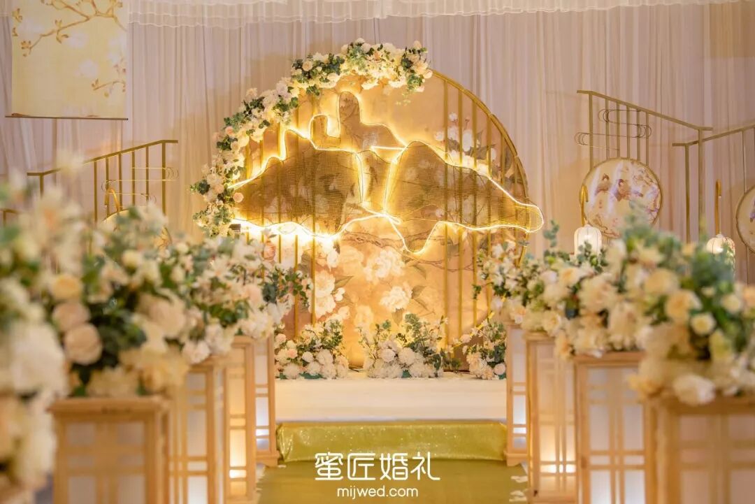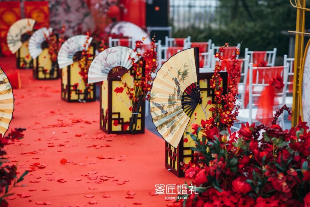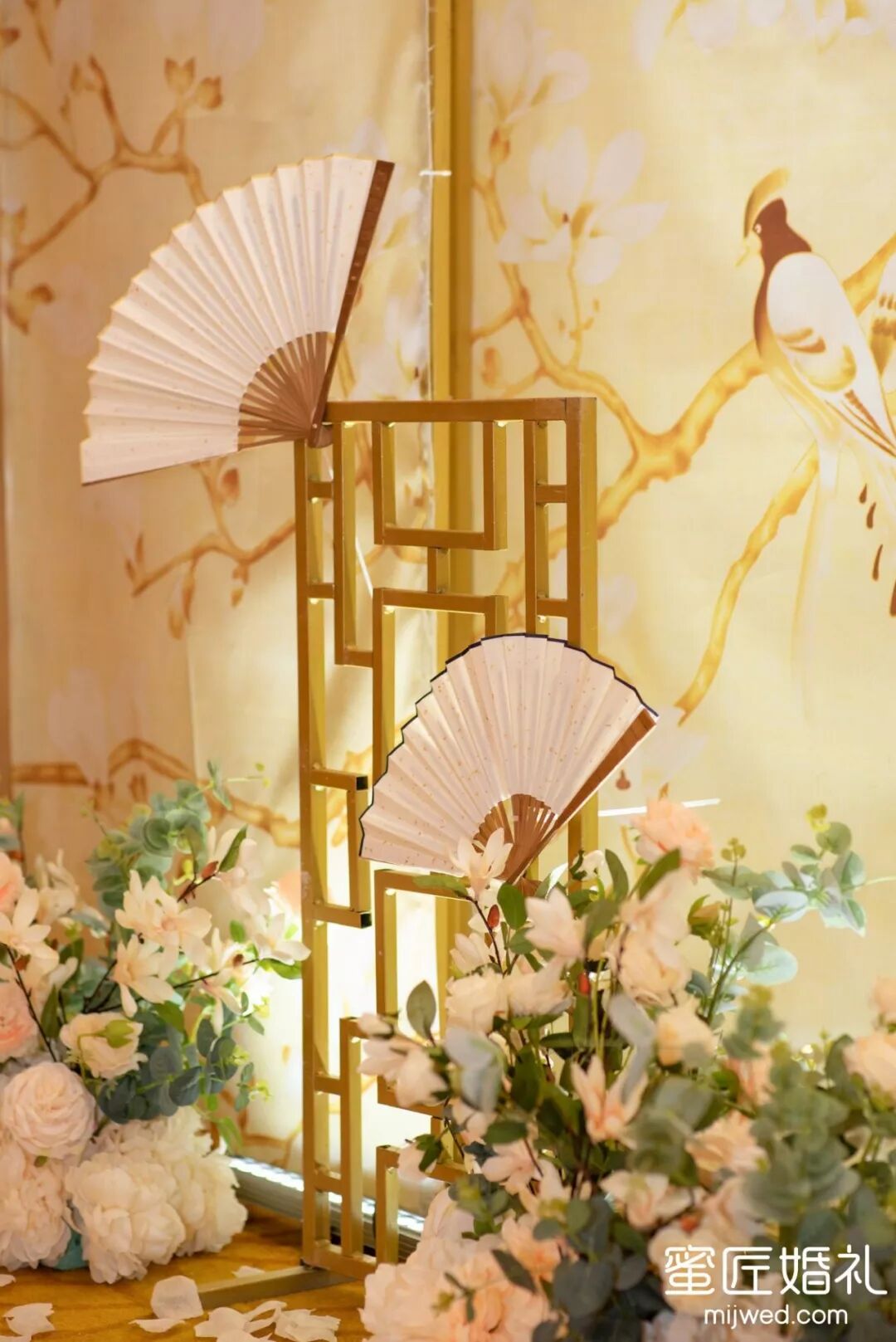 中式婚礼更能表现出中国人温柔细腻的情感,含蓄的表达透露着隽永的情谊,表现力更为高级,在这场婚礼中,中国风的元素有很好的体现,在书香折扇的衬托之下,更显恢弘大气。