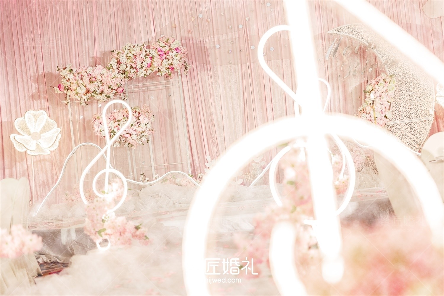基础款:静谧蓝与水晶粉的融合,弯月与音符的碰撞,使得整场婚礼唯美而梦幻,发光装饰定制铁艺道具,跳跃的音符带来了灵动活力,皎洁的月光散发出优雅纯净的光芒。