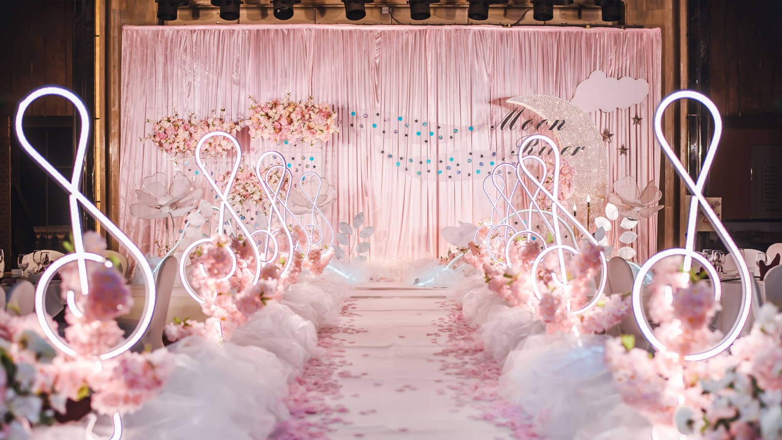 舞台是婚礼上的聚焦点,通常舞台背景都是以婚礼主题色彩纱幔来布置,它不能过于单调,同时也不可以过于花俏,做到刚刚好。你也可以在舞台背景墙中央设计个专属自己的LOGO,也可以放个LED来分享自己的爱情。
