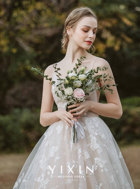 外景拍摄,若是有这样的环节, 可以选择轻便一些的纱质的轻纱,这一环节的服装可以跟其他的环节服装共用同一件,做不同的造型,也会有不一样的感觉