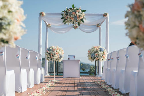 草坪婚礼在草坪,仪式台也是需要额外搭建。选择一张新人的巨幅海报,挂上舞台当背景,周围边框用丝绸和鲜花包围,舞台上铺设摆地摊,周围用白色百合花围起来。并在中间放置一个宣讲台,上面放上白玫瑰,用于主婚人、新娘们致辞使用。