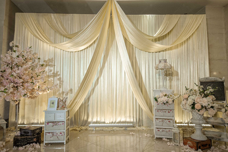 设计点:米色风灯、雪纺布幔、白绿花艺