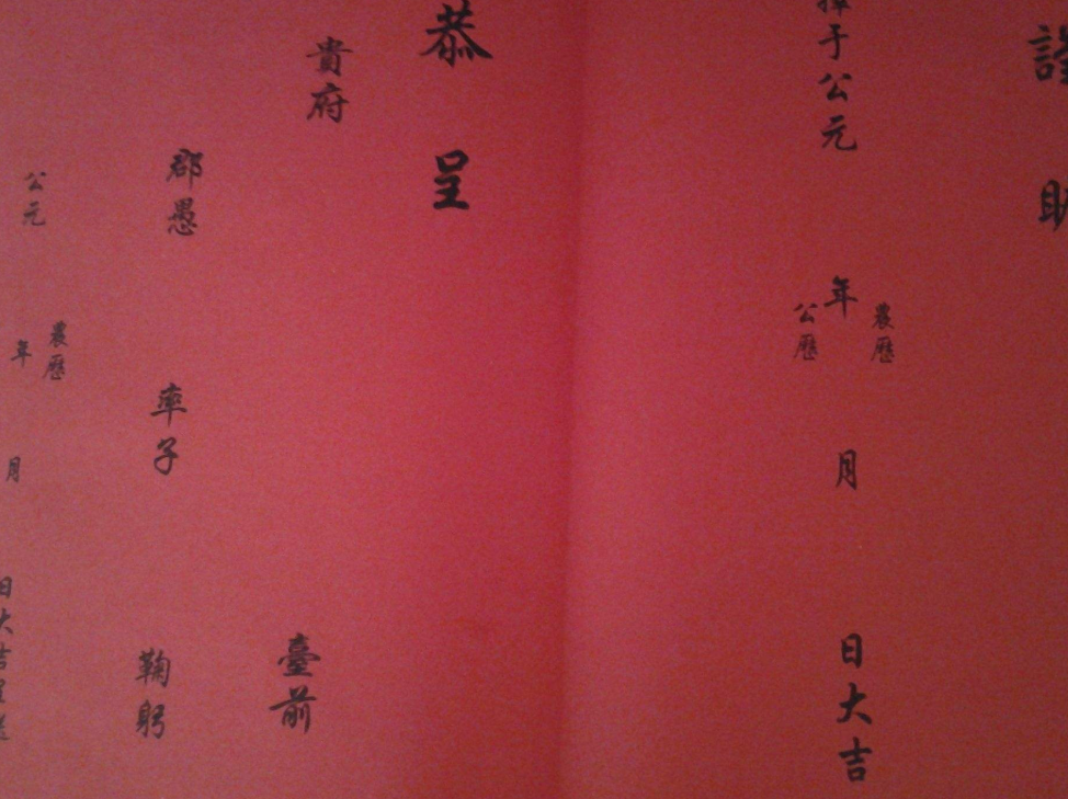 12、仅订於公历,二0一0,年,十,月,一,日,公历二0一0,年,八,月,廿四日星期,五,,为,我女婿XXX,女儿XXX,举行结婚典礼,是日假座,XXX大酒店四楼宴会厅,敬备喜酌恭候,光临