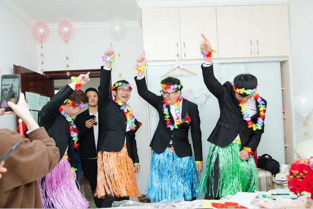 首先,在网络上找一些诸如广场舞之类的舞蹈(如前段时间流行的小苹果。这个游戏是要等新郎闯进一道门后再进行的。新郎进门后,让其站在前面,伴郎则在其身后排成一排,找出刚才找到的视频,让新郎带领伴郎集体跳此舞蹈。