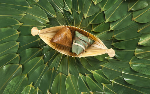 3、现在开始涂色吧!我们先给主题涂上黄色和橘红色,花朵涂上彩色,粽子涂绿色,底部的浪花涂上深蓝色和浅蓝色。