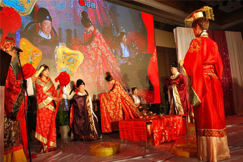5、拜堂:一般主持人会叫新人怎么做,一来面对席台一拜天地,二来面向来宾二拜,其三拜则面对自己的父母,最后新人面对面对拜,以示二人已正式成为夫妻。