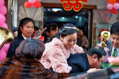 1. 到男方家:接亲的车队/轿子开到新郎家门口时,打开车门/轿门迎接新娘前,新娘的舅舅拿着两个麻袋,一步步铺好,新娘需踩着麻袋进了家门,据说这是“传宗接代”的意思。正宗老绍兴是不允许公婆露面的,这时要避开躲轿煞。