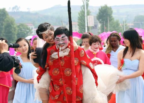 2.讨喜:新郎和女方的家人见面后,新郎要捧手捧花给新娘,这个时候,新娘的伴娘会故意拦住新郎,伴娘提的条件新郎要是答应了,就可以放人进入新娘的房中。