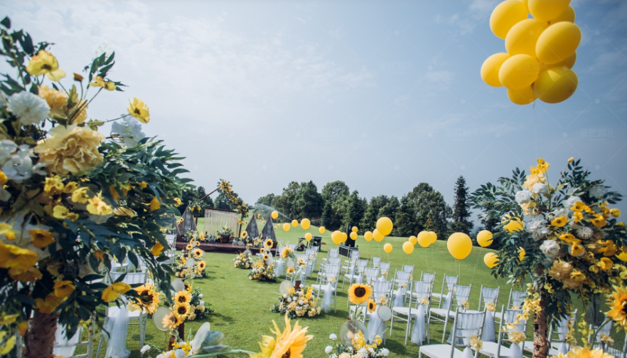 1.婚礼仪式区:田园风格婚礼仪式区布置选用了柠檬黄和绿色搭配,让整个婚礼显得清新而活泼!
