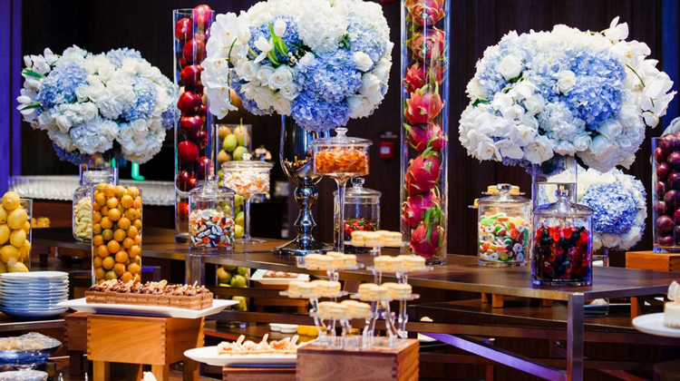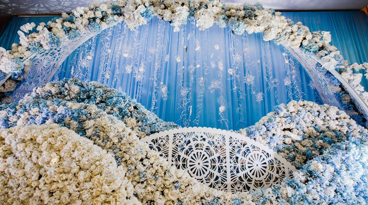 在婚礼开场前和结束后,灯光效果要突出温馨浪漫。这两个过程中,多用彩灯,用琥珀色、桃红色、金色来代替刺眼的白炽灯,不但缤纷美观,光线柔和而且可以营造出空间的效果和变幻的意境。还可以适当调暗灯光,把所有的灯光调暗大约百分至三十,营造一个整体舒适和谐的环境。可以让灯光自下而上柔和的照射在大厅的房顶上,这要比从上向下直射的灯光怡人得多。如果灯光直接投射在人的脸上,会使嘉宾有刺眼的感觉,产生空间局促感和压抑感。