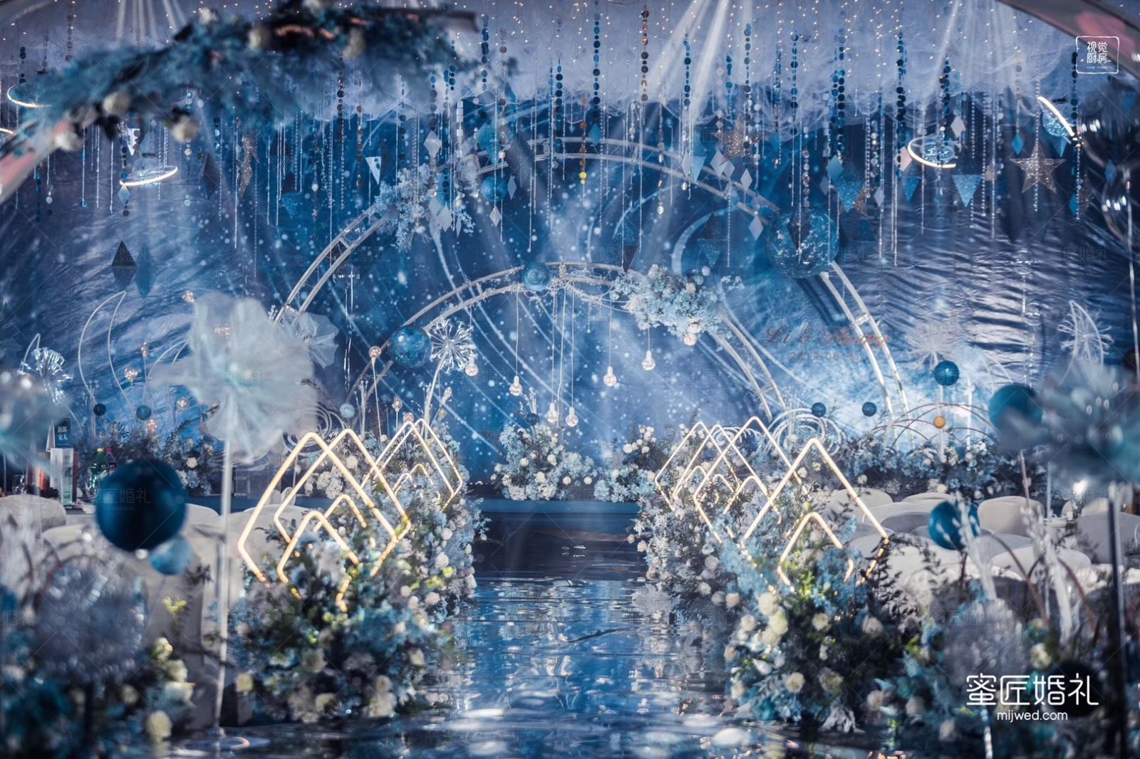 仪式通道:几分欲说还休的朦胧意境,妙不可言;星光时空门梦幻恢弘,星光球错落有致,定制灯具光彩夺目。