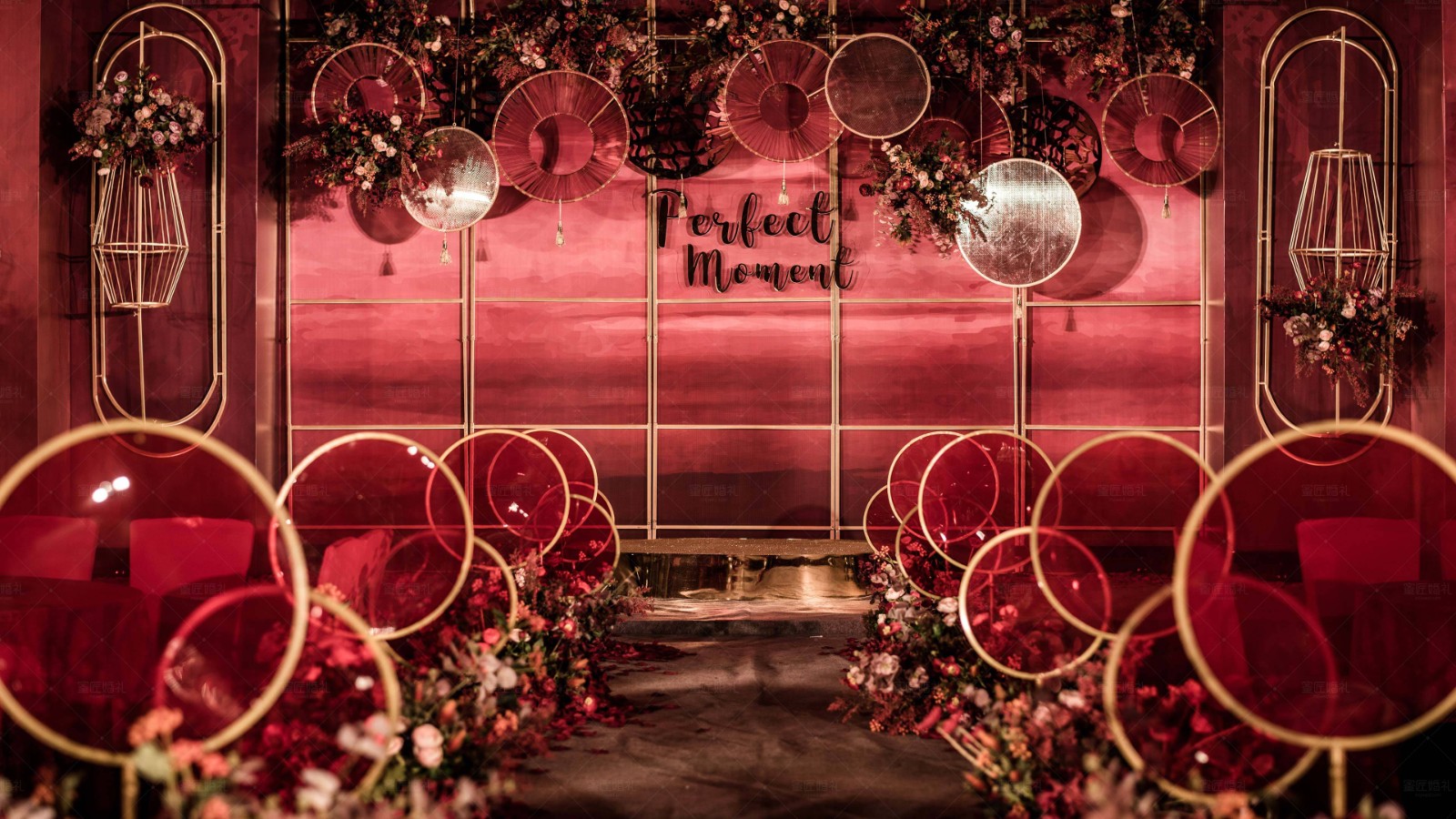 主舞台:一繁一简,打造华贵高端质感,组合喷绘板低调复古,金红配色热烈而高贵。