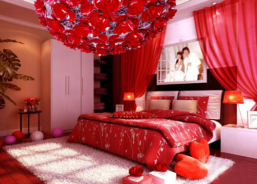 1、红色婚床、撒落粉色花瓣、大红喜字。无论是潮流如何的流行,中国的流行风中总是少不了中国传统的东西的。中国人结婚都是喜欢使用大红色的,使用大红色的婚床布艺用品,再配上带有卡通形象的靠垫,使用气球来制作一个粉色的心形,在两个气球上面画上可爱的笑脸。最后将粉色玫瑰花的花瓣撒落在婚床上,在合适的位置贴上大红喜字即可。