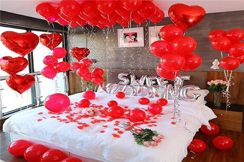 如果想把新娘房布置浪漫一些,可以采用粉色的浪漫气球布置出心型的形状,还可以在天花板上点缀几个粉色的气球,这样可以让整个婚房看起来温馨浪漫。用气球来装扮婚房真的不错呢,可以用气球布置出任何自己想要的形状,两个心型表示了夫妻之间两颗紧密相连的心。