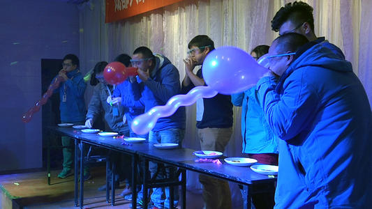 规则:分3组,2-3人一组,组员各持一双筷子,由组员A将球从一个盘中夹出,再由组员B夹起放入另一盘中,当组员B把球夹到盘中时,组员C戳爆气球,依次类推看哪组在2分钟内,夹出的球最多为胜,拿奖或输者表演节目。