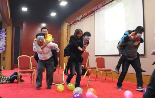 两人一组(一男一女),两人用背夹住一个气球,将气球运输到终点的椅子上,然后坐爆气球,重新返回起点传递,单位时间内坐爆气球最多的小组获胜。