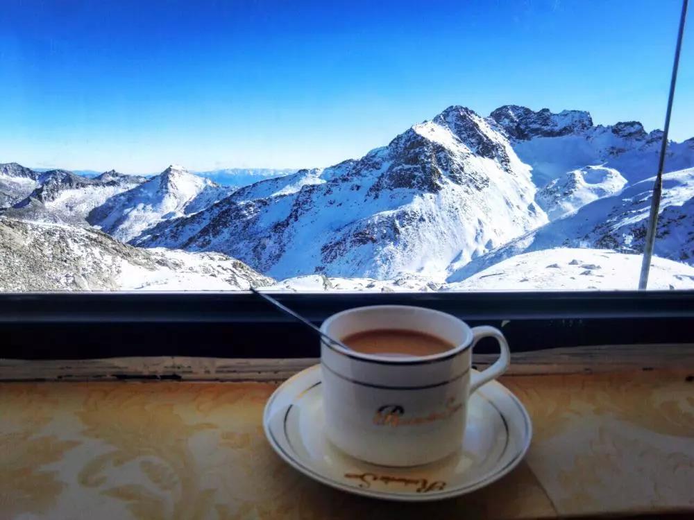 在山顶上,咖啡馆四周全是白雪,品尝一杯咖啡,甚是惬意。