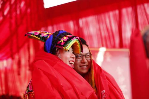 新郎妖娆好,脱掉蓝衫换紫袍,