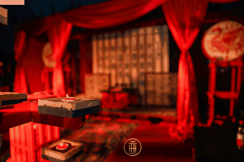 2、撒谷豆及掀盖头:新人手牵红绣球(其意为驱邪避刹兼喜庆之意。)步入宴会厅的过程中,由伴郎、伴娘在前方丢撒盛有谷物、核桃、红枣、花生、钱币的托盘,随着新人走动,一边撒托盘里的东西,至到主台方为结束。登上舞台后,新娘跪坐舞台中央,由新郎拿起喜棒揭起盖头。