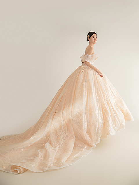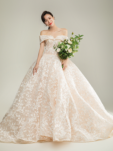 1、蓬裙婚纱:蓬裙款式的婚纱可以将,下身的线条遮挡住,不会显的太胖。