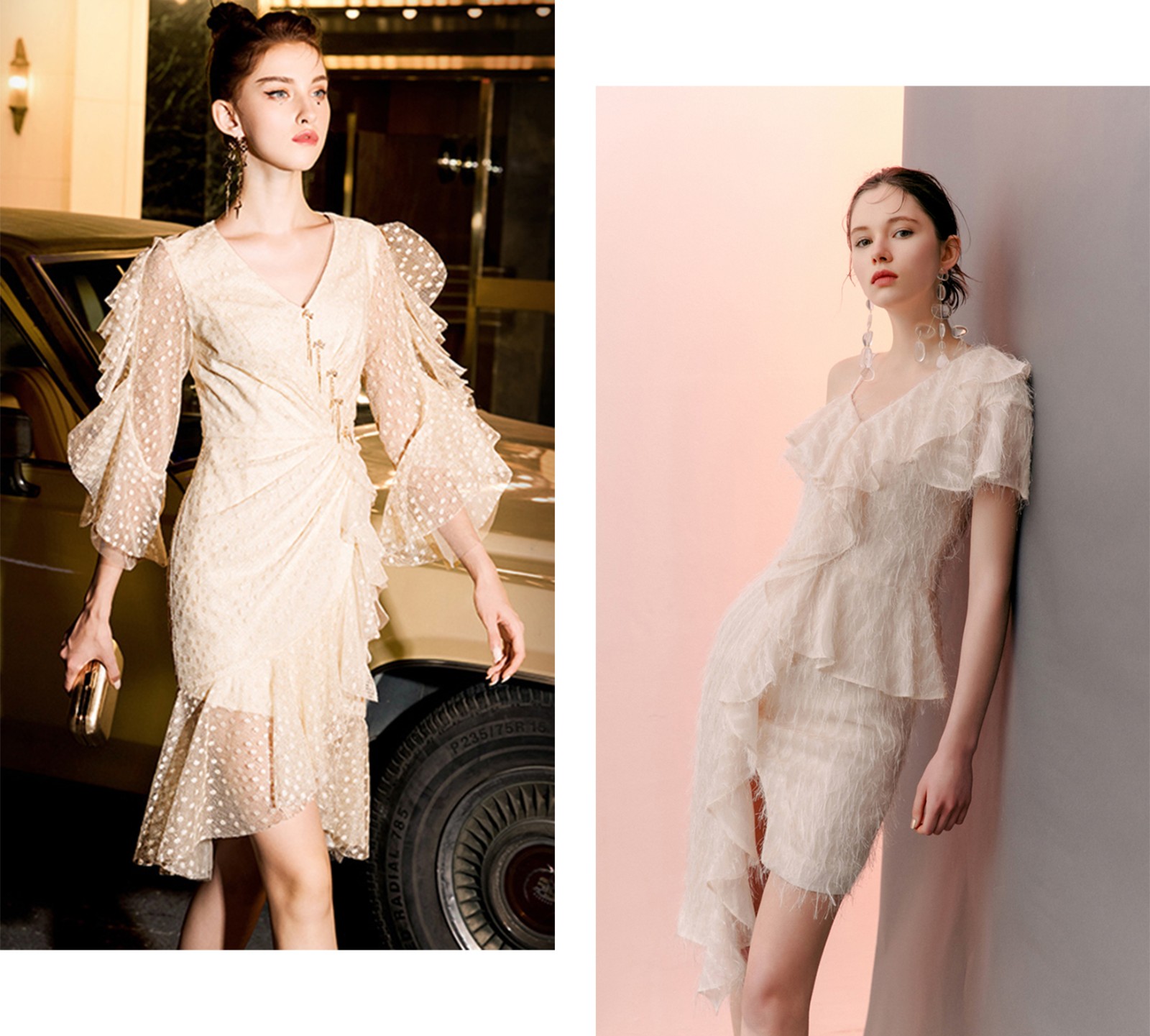 尤其是礼服的裙摆,可以挑选那种飘逸一点的款式,荷叶边、木耳边都是不错的选择。