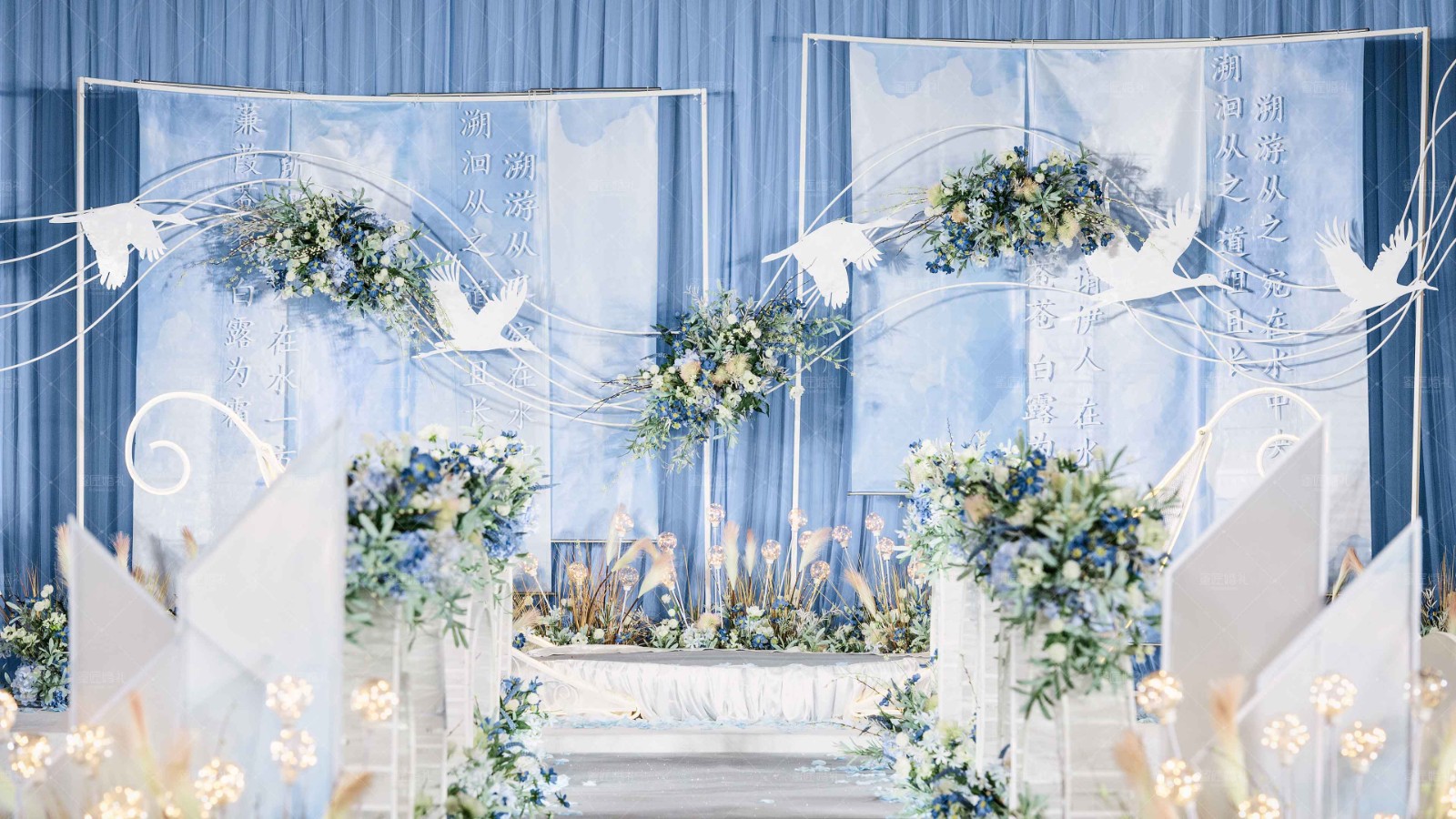 苇草摇曳,清雅野趣的花艺点缀在水蓝纱幕中,清新的蓝裹挟着淡淡的粉,明媚而轻柔,宛如身在朦胧水境。