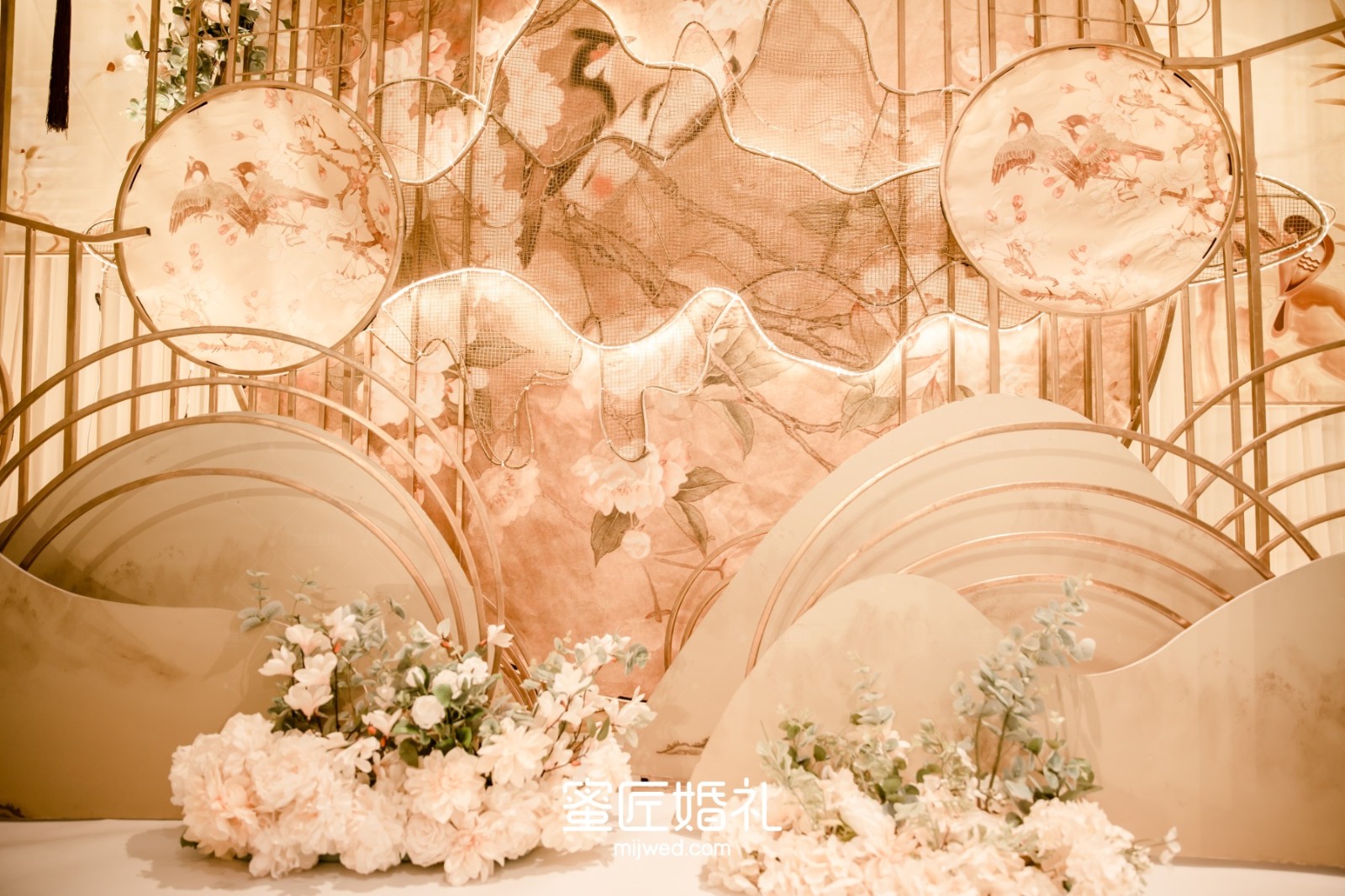 抛却传统的中国大红风格,古朴素雅的色调与有着中国传统元素相辅相成的新中式风格,象形山岚造型、建筑风格的屏风设计、摇曳生姿的芦苇花艺,带你走进一个充满中式情怀的东方绮梦。