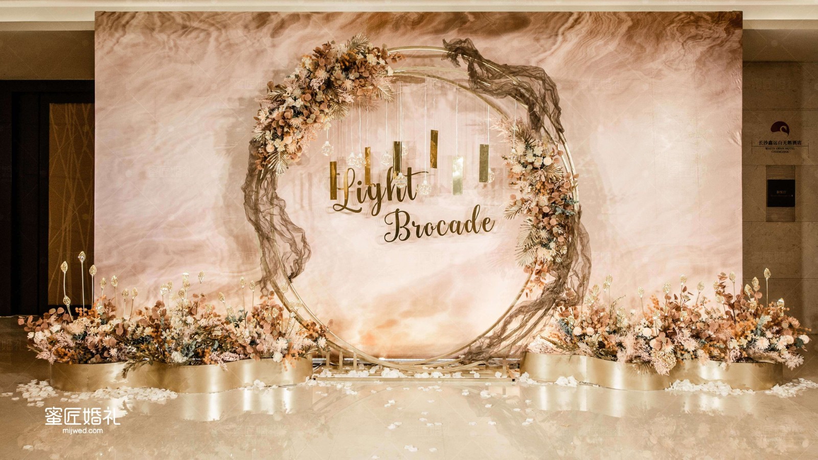 迎宾区:金属圆环点缀斜角花艺,圆满的爱情热烈浓郁,手工上色的咖啡金属网纱,飘逸柔情如你,暖光满天星龙珠灯垂挂,带来一室流光溢彩。